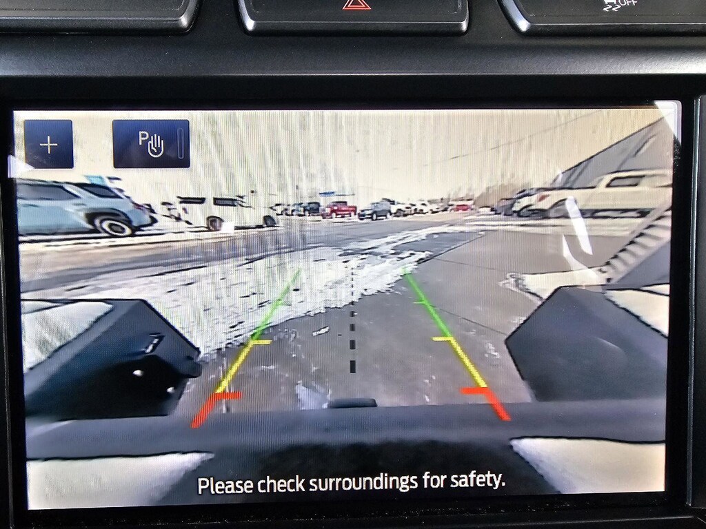 - The vehicle is equipped with a camera that displays an image of the area behind the vehicle on an interior display.